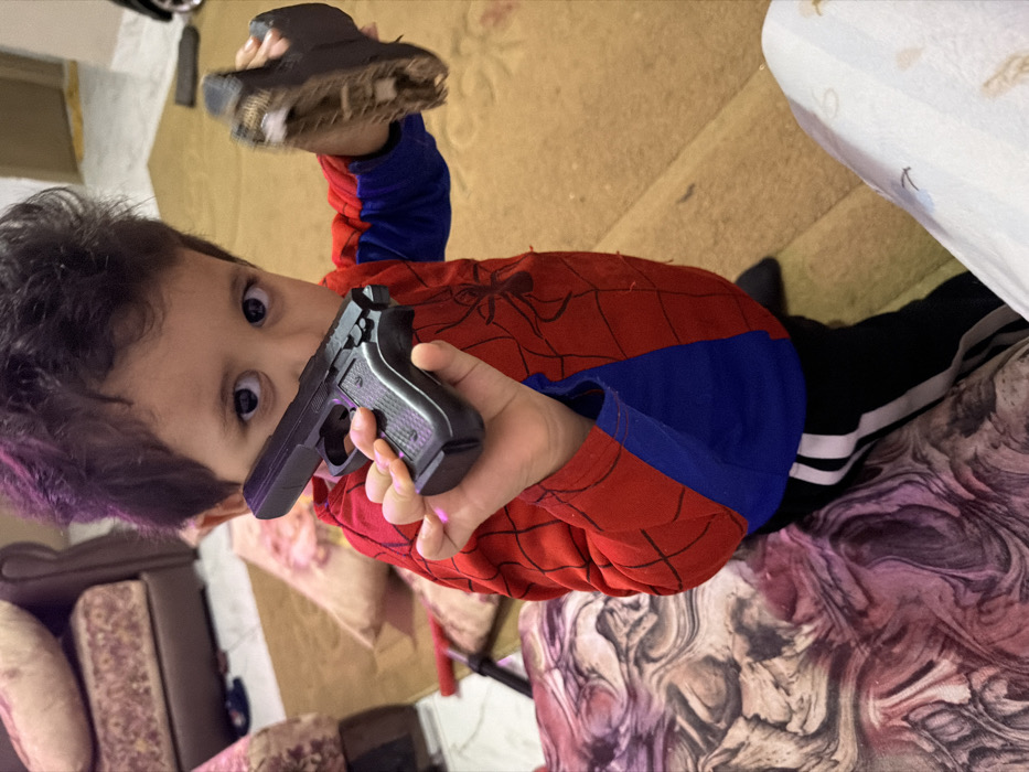 The image depicts a young child positioned indoors within a residential setting in Dar Bouazza, Morocco. The child, with dark hair and eyes, is wearing a red and blue long-sleeved shirt featuring a black spiderweb pattern and black athletic pants with white side stripes. The child looks directly forward, engaging the camera. In their left hand, a black replica handgun, consistent with a toy, is held with the barrel angled slightly upward. In the child's right hand, a damaged dark-colored object, appearing to be the sole and interior structure of a shoe or sandal, is held up. The background includes a brown upholstered armchair with patterned cushions, lighter patterned cushions on the floor, and a light brown carpet or rug covering the floor. A portion of a dark object, possibly a cleaning implement, is visible on the floor to the left.
