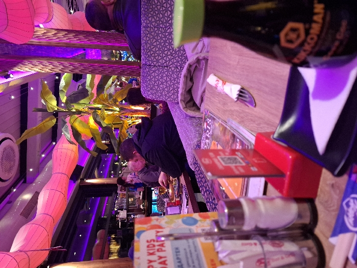 The image captures the vibrant interior of a Happy Bar & Grill restaurant in Sofia, Bulgaria. The scene is illuminated by strong purple and pink ambient lighting, creating a distinctive atmosphere. In the immediate foreground, a wooden table displays a partial place setting. Notable items include a dark ceramic plate with a white and purple triangular design, a black Kikkoman soy sauce bottle, and a glass container holding multiple white paper-wrapped chopsticks, alongside salt and pepper shakers. A red plastic stand prominently features a menu or promotional card with a visible QR code. A white, rolled napkin with a fork and knife rests on the table, and a "HAPPY KIDS BIRTHDAY PARTY" flyer is partially visible. In the mid-ground, several patrons are seated at wooden tables. A man in a dark hoodie is seen from the back, leaning forward over a table, with another man seated next to him. Behind these individuals, large artificial tropical plants with green and yellow leaves add to the vibrant decor. The ceiling above features multiple long, illuminated pink fabric structures, resembling stylized tubes or clouds, with white air conditioning vents also visible. Further in the background, more diners occupy seating areas upholstered in a grey and purple geometric pattern. A service counter or bar area is faintly visible, with a person in a light-colored top standing behind it. The overall environment suggests a lively and modern casual dining establishment.