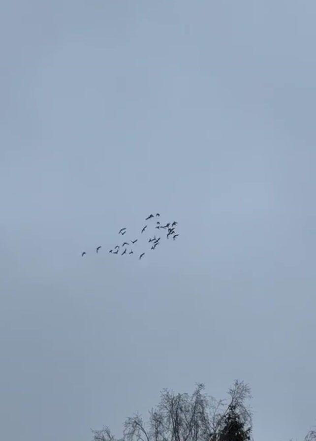 flock of birds flying across a gray, overcast sky. In the lower portion of the frame, there are several trees, including bare deciduous trees and evergreen trees. As the video progresses, the flock of birds flies farther into the distance, eventually disappearing from view, and the camera angle shifts upward to focus more on the sky and treetops.