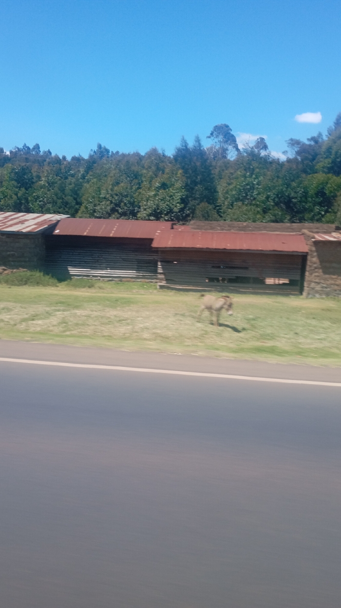 An exterior shot captures a rural scene with a long, straight road in the foreground. Beyond the road, a grassy verge leads to a structure with a corrugated metal roof and rough, possibly stone, walls. An animal, possibly a donkey, stands in the grass. A line of green trees forms the backdrop beneath a clear blue sky. The composition suggests a sunny day and a relatively isolated location.