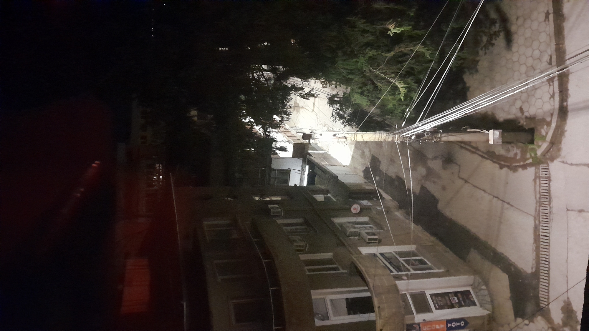 This image depicts a nighttime elevated view of a street and buildings in Svishtov, Bulgaria. The scene is illuminated primarily by artificial streetlights, casting distinct shadows and reflections on wet ground surfaces. In the foreground and left midground, a multi-story building with a curved facade is visible. Its ground floor features a commercial storefront with large glass windows and a door, displaying a partially visible vertical sign reading "СПОРТ ТОТО" (Sport Toto). Above, several windows, balconies with railings, and multiple exterior-mounted air conditioning units are present on the building's facade. In the mid-right, a tall utility pole heavily laden with numerous overhead electrical and communication cables extends across the frame. A small, rectangular electrical box is affixed to this pole. The ground directly beneath shows a paved surface transitioning from concrete slabs with a linear storm drain grate in the lower foreground to hexagonal paving tiles further right. Puddles or wet patches on the pavement reflect the available light. A narrow, paved alleyway separates the primary curved building from another, less distinct structure further back on the right. A large, dark-foliage tree, likely an evergreen, occupies the right side of the image, with its branches extending into the center. The background is predominantly dark, indicating the night sky, with distant, scattered artificial lights from other buildings or infrastructure visible on the horizon. Reddish light streaks or reflections are present in the upper portion of the image. No individuals or active interactions are visible within the scene.