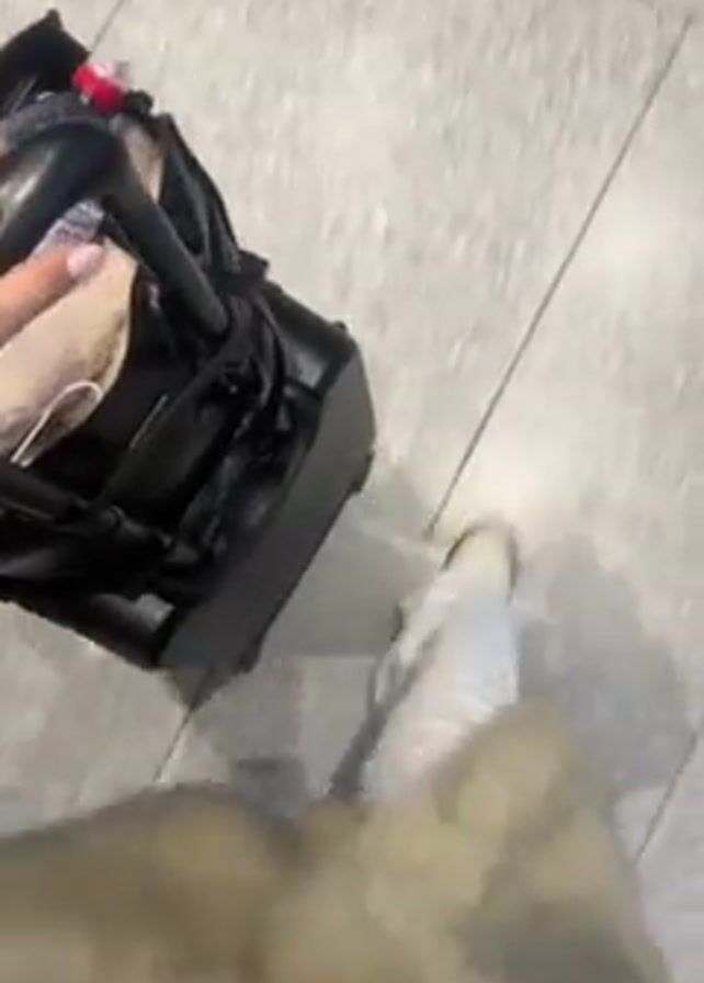 A person is pulling a black rolling suitcase across a tiled floor. The suitcase appears to contain a pair of black high-heeled shoes and other items. The person's hand is visible on the handle of the suitcase. Only the lower part of their body is visible, showing pants with a speckled pattern, white shoes, and tan fur. The floor is composed of large, light gray tiles.