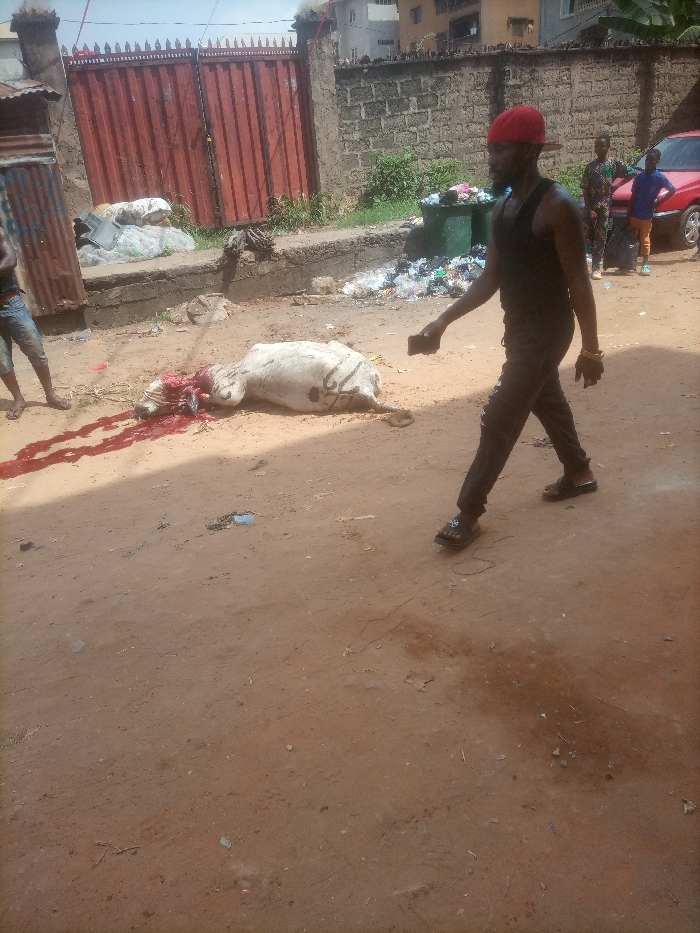 The image displays a daytime scene on an unpaved, reddish-brown dirt street in Onitsha, Nigeria. In the central mid-ground, a light-colored animal, consistent with a cow, lies on its left side. Its head area is heavily bloodied, with a distinct pool and trail of dark red blood extending onto the dirt surface. In the foreground, walking from right to left, is a male subject wearing a red baseball cap, a black sleeveless top, dark trousers, and dark sandals. He carries a dark rectangular object, possibly a mobile phone, in his right hand and has light-colored wristbands on his right wrist. To the far left, the lower legs of another individual are partially visible near a corrugated metal structure. In the background, a tall concrete block wall topped with metal spikes extends across the scene, featuring a large red metal double gate. Behind this wall, multi-story buildings are observable. To the right of the walking subject, near the wall, two green, open-top garbage bins are visible, overflowing with refuse. A substantial amount of litter and debris is scattered on the ground around these bins and along the base of the wall. Further in the background, a red car is parked, and three additional male figures are standing in its vicinity. The overall environment suggests an urban or semi-urban setting with visible signs of waste accumulation.