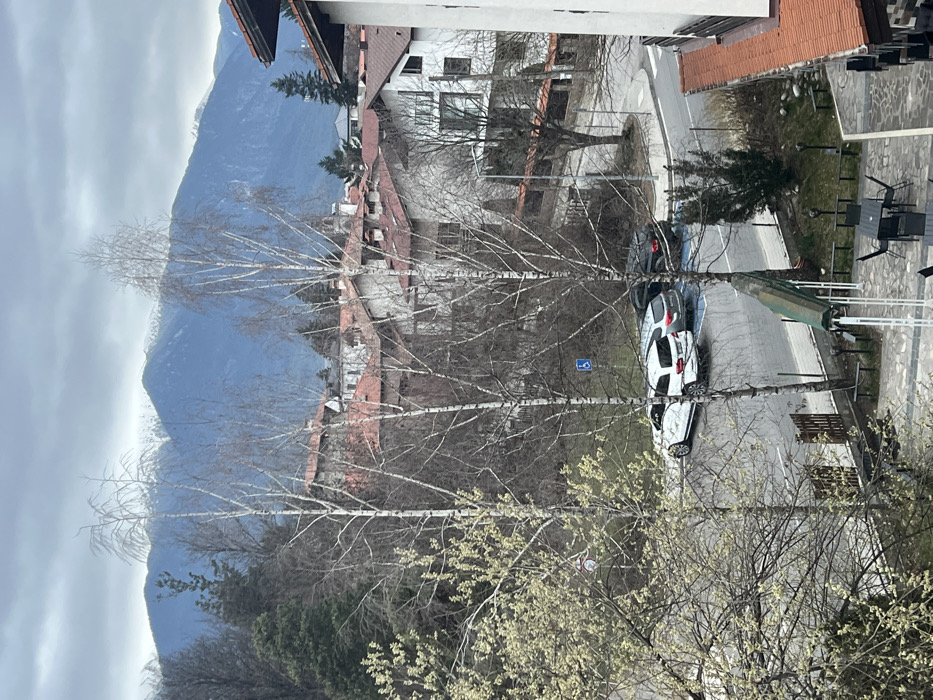The image depicts an elevated view of a scene in Bansko, Bulgaria, under an overcast sky. In the background, a prominent mountain range with visible snow patches on its peaks rises against a light grey, cloudy sky. Below the mountains, numerous residential-style buildings with light-colored facades and red-tiled roofs are visible, interspersed with bare deciduous trees and some evergreens. In the midground, a paved road curves through the scene. Adjacent to the road, a parking area contains three parked vehicles: a white Mercedes-Benz station wagon/SUV, a darker grey SUV partially obscured by the white vehicle, and a black SUV. A blue sign indicating disabled parking is clearly visible in the parking area. Several tall, slender birch trees with white bark, largely devoid of leaves, stand along the edge of the road and parking area, with one tree obscuring part of the white SUV. The immediate foreground features a section of a building on the right, characterized by a white wall and a terracotta-tiled roof edge. Below this, an outdoor patio area is visible, furnished with at least four dark metal tables and matching chairs on a stone-paved surface. A green, elongated structure resembling an awning or slide is also present near the patio. On the left side of the foreground, a large tree with light green/yellow budding leaves signifies the early spring season. No individuals are present in the visible scene.