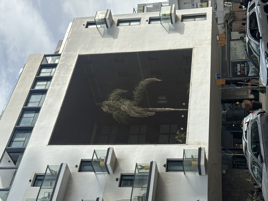 The image displays a multi-story, modern building with a light-colored, possibly white or off-white, facade. A large, rectangular, recessed void is present in the center of the building's facade, spanning multiple floors. Within this void, a tall, mature palm tree with somewhat dried fronds stands prominently. The interior of the void appears dark, revealing some windows and a few illuminated globe lights at its base, suggesting an internal courtyard or atrium area. The building features numerous balconies on its left and right sides, each with transparent glass railings and dark metal frames. Several balconies contain small yellow-potted plants, and some have outdoor furniture like chairs and small tables. The uppermost visible section of the building has horizontal bands of windows and a darker, possibly concrete, finish. At street level, the building incorporates commercial storefronts with large glass windows. Parked or moving vehicles, specifically a silver SUV and a white SUV, are visible on the asphalt street in the foreground. Several indistinct human figures are present on the sidewalk to the right. A pole with yellow street signs is visible, along with a large street-level advertisement sign featuring Hebrew text, which includes "נשארים בת"א" (Remaining in Tel Aviv) and a price indication ("2,699,000"). The sky above is partially cloudy. Based on the Hebrew text visible on the advertisement sign, the location is identified as Tel-Aviv, Israel.
