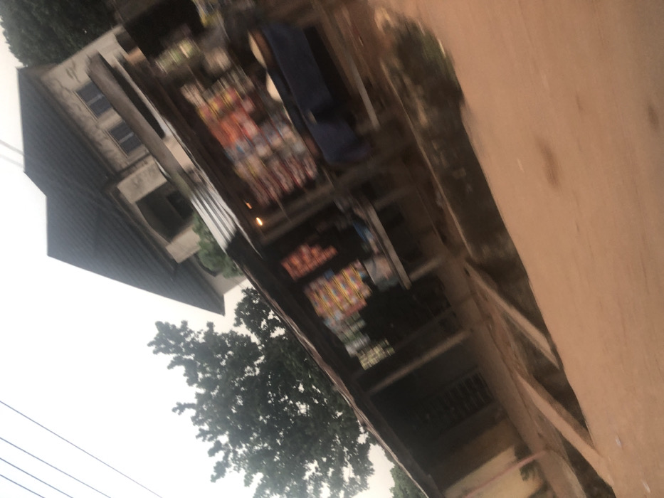 A slightly blurry, tilted, daytime shot depicts a street scene. A building with a dark roof and light-colored walls stands to the left. A tree with dense foliage is near the building. Opposite, a wall with a clay-like tone is visible. A shop with shelves laden with colorful products occupies the center. A blue object sits atop the goods. The lighting suggests an overcast day, casting a soft, diffused glow over the scene.