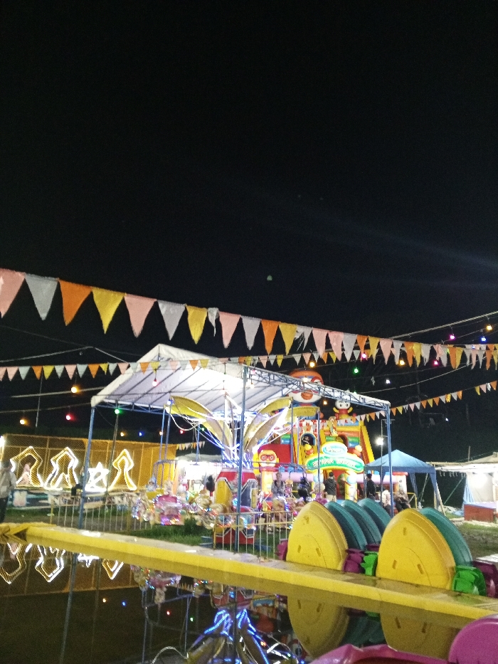 A brightly lit carnival scene at night features colorful bunting strung across the top
