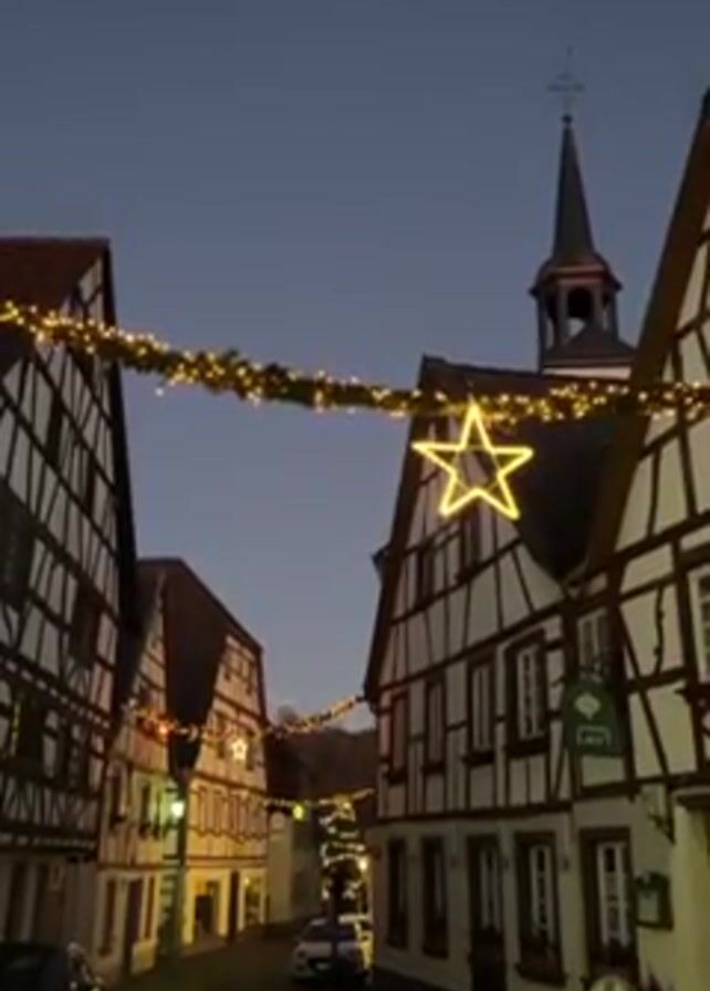 quiet street in a European town at dusk. The street is lined with half-timbered houses, decorated with Christmas lights and stars strung across the road. A church steeple is visible in the background. There are a few parked cars on the street.