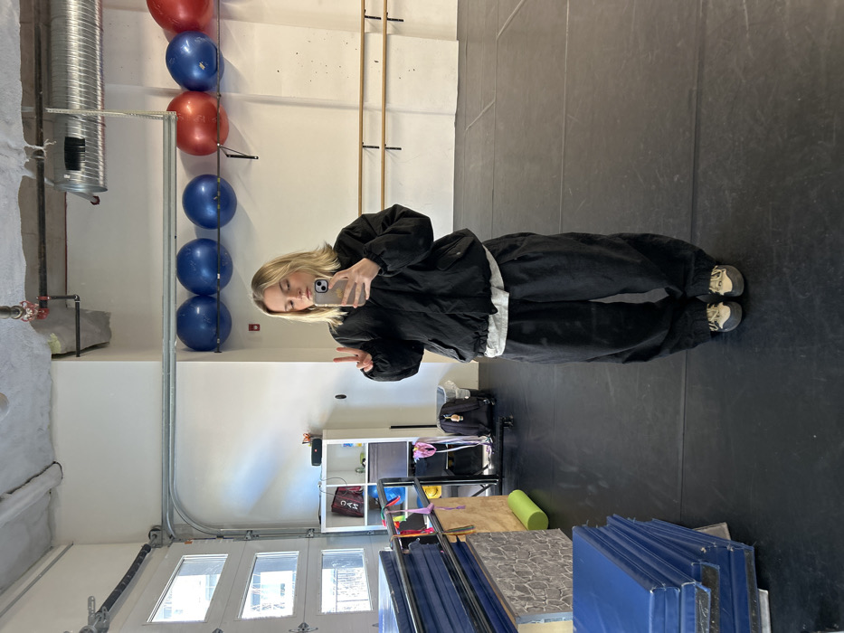 A person with blonde hair is taking a selfie in a gym or dance studio. They're wearing a black jacket and pants with white accents, and patterned shoes. Behind them are exercise balls attached to a vertical pole and dance bars are on the wall. Gym equipment is in the foreground, and windows are along the far wall. The floor is dark.