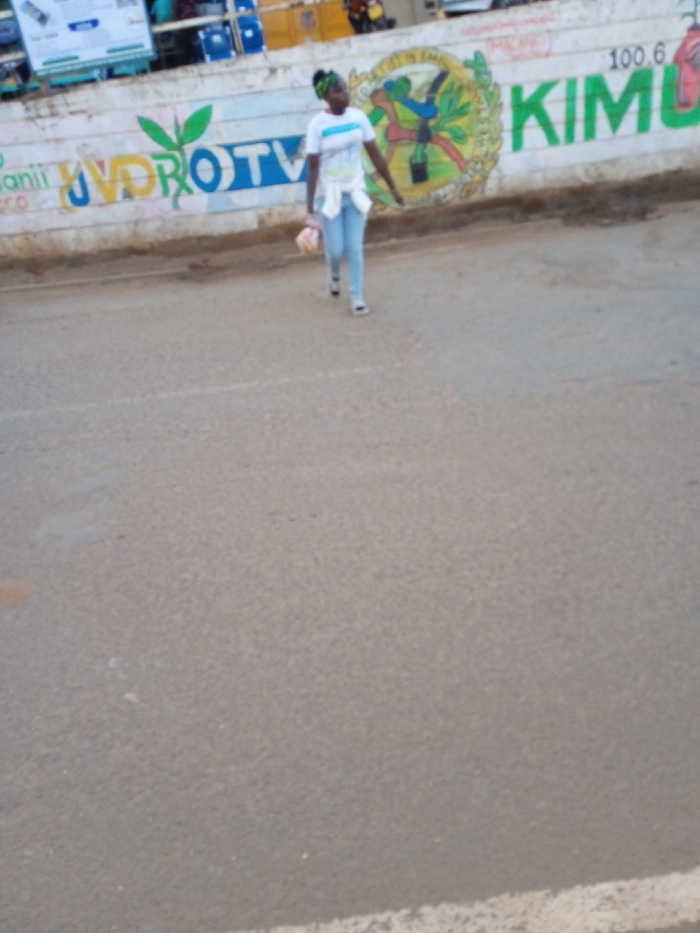 A woman walks across a paved road. She wears a white t-shirt, light blue jeans, and dark shoes, carrying a pink item in her left hand. Behind her, a wall displays graffiti and signage. "HYDROTV" and "KIMU" are visible, along with a circular emblem. A building and vehicles are partially visible in the background. The road takes up a significant portion of the frame.