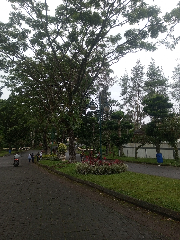 A road paved with dark bricks curves through a park-like area. Lush green trees line the road, some towering overhead. Manicured grass areas with flower beds add splashes of color. A group of people walk along the side of the road, and a person rides a scooter in the same direction. Tall pine trees stand in the background near a white wall. The sky is overcast.