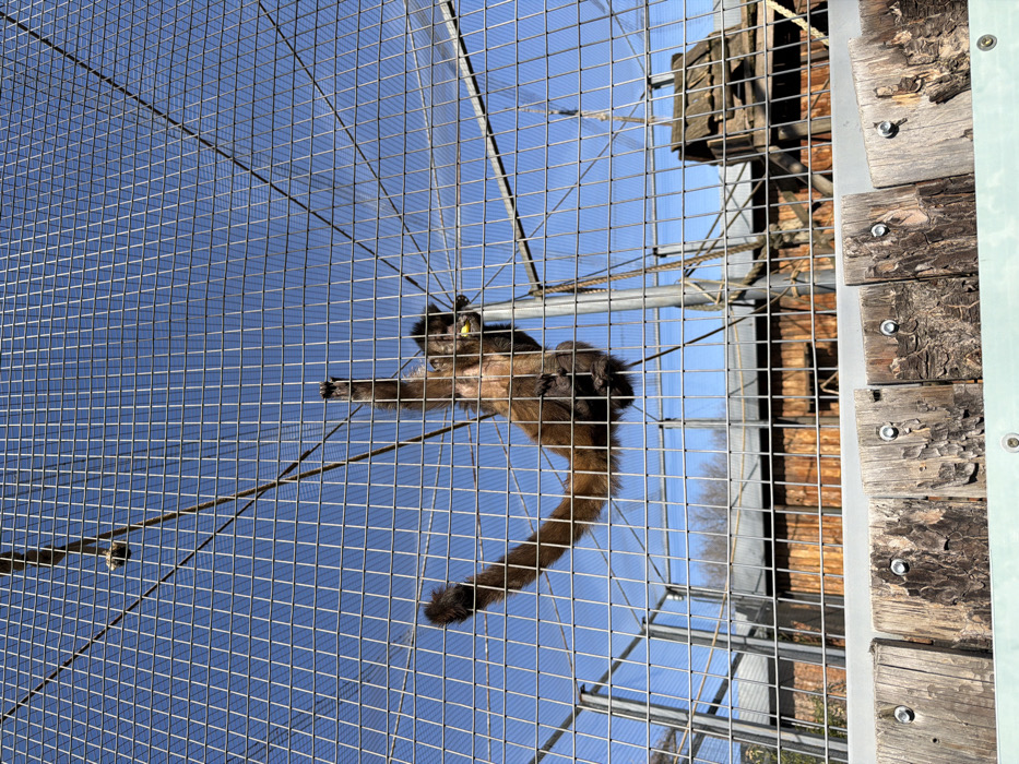 - "A brown-furred monkey, consistent with a capuchin species, is suspended upside down by its right hand from a thick rope or cable within a large outdoor enclosure" by FM-8iUEh1, licensed under CC BY 4.0