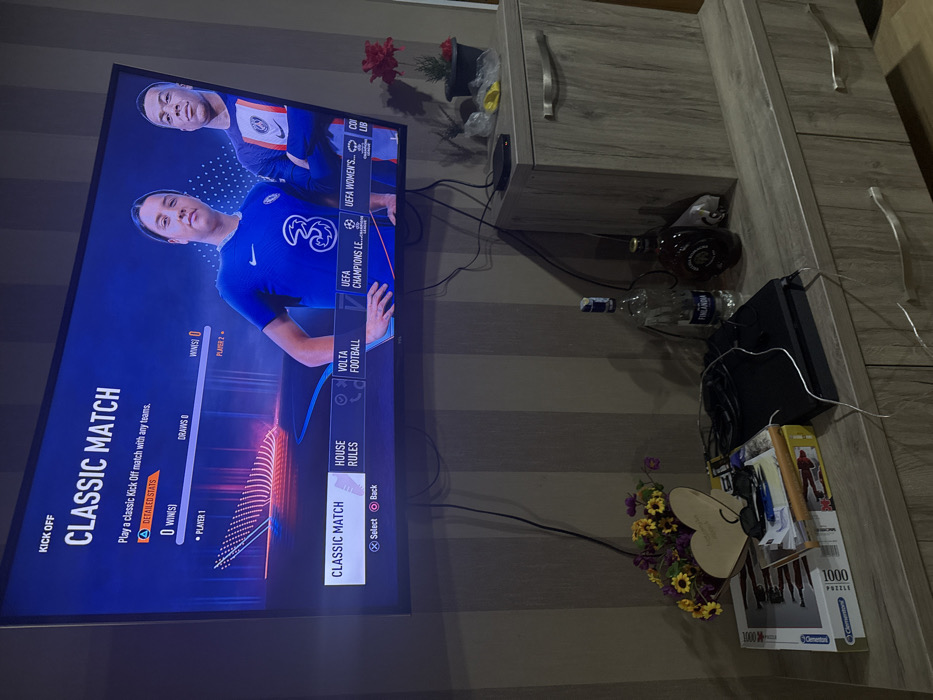 This image depicts an indoor domestic setting, likely a living room or entertainment area. The specific location within the city of Tbilisi, Georgia, cannot be determined from the visual information provided. The central focus is a large, wall-mounted flat-screen television displaying the user interface of a "CLASSIC MATCH" mode from a FIFA video game. The screen shows two prominent footballer figures: Sam Kerr in a blue Chelsea kit on the left and Kylian Mbappé in a PSG kit on the right, under a "KICK OFF" title. Game options such as "CLASSIC MATCH," "HOUSE RULES," "VOLTA FOOTBALL," and "UEFA CHAMPIONS LEAGUE" are visible at the bottom of the screen. Black cables descend from the television, partially visible against the wall. Below the television, a wood-effect laminate entertainment console or TV stand is present. It consists of a longer lower unit with multiple drawers/cabinets and an elevated, narrower cabinet unit on the right. Arranged on the lower section of the TV stand, from left to right, are: - A rectangular box for a "Clementoni 1000 puzzle," featuring an image of multiple people. - Stacked items on top of the puzzle box, including a book, a utility knife with an orange handle, and a pair of dark sunglasses. - A heart-shaped light wood container holding artificial yellow sunflowers and purple flowers. - A black gaming console (likely PlayStation) with a white cable connected to its front and other black cables extending from its rear. - A clear glass bottle, partially consumed, with a "FINLANDIA" label (vodka). - A dark-colored bottle, likely containing spirits (e.g., whiskey or brandy). On the elevated right section of the TV stand, from left to right, are: - A small, flat, black electronic device, possibly a streaming box or router. - A potted plant containing artificial red flowers. - A clear plastic bag with a yellow object visible inside. The wall behind the television and the console is covered with wallpaper featuring vertical stripes, alternating between a lighter and a darker shade of a neutral color, such as beige or grey. No individuals are present in the image. The scene suggests a paused game or preparation for gameplay, indicating recent or imminent human activity in the area.