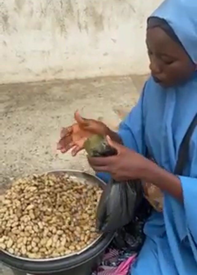 A woman in a blue head covering and garment sits beside a black bucket filled with peanuts