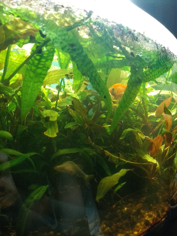 The image displays the interior of a heavily planted freshwater aquarium in an unknown indoor setting. The scene is dominated by various aquatic plants, primarily green, with some reddish-brown foliage. Several large, textured green leaves, possibly Java Fern, are prominent, extending towards the water surface where numerous small, dark-shelled snails are visible adhering to the plants and potentially the tank walls. One orange goldfish is partially visible amidst the vegetation in the upper right section. A second, elongated fish with a light brown or grey coloration is present near the bottom left, partially obscured by plants and reflections on the tank glass. The aquarium floor is covered with light brown gravel. An artificial light source is visible as a bright illumination point at the upper right, casting light onto the water's surface. No human subjects are present.