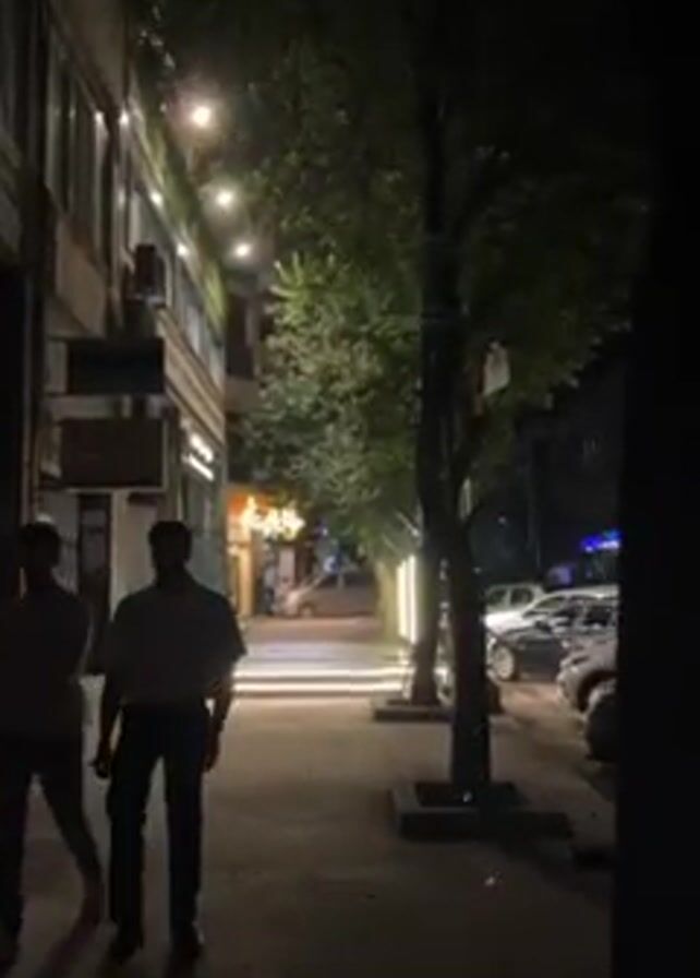 At night, a camera captures a scene on a city street. The street is lined with buildings on one side and trees on the other. Two men are walking away from the camera on the sidewalk. The buildings have signs, lights and air conditioning units. Trees line the sidewalk and street. Cars are parked along the street further from the camera. The street is lit by street lights and lights from the buildings.