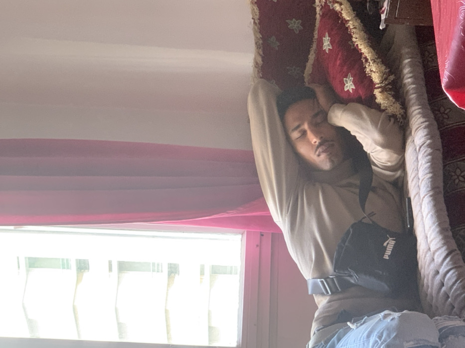 A male individual is depicted lying on his back on a patterned couch, eyes closed, in an indoor setting in Tangier, Morocco