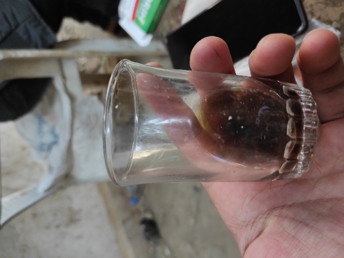 - "The image depicts a human hand holding a small, clear glass tumbler containing a dark brown to black, viscous substance settled at the bottom" by FM-oaYm93, licensed under CC BY 4.0
