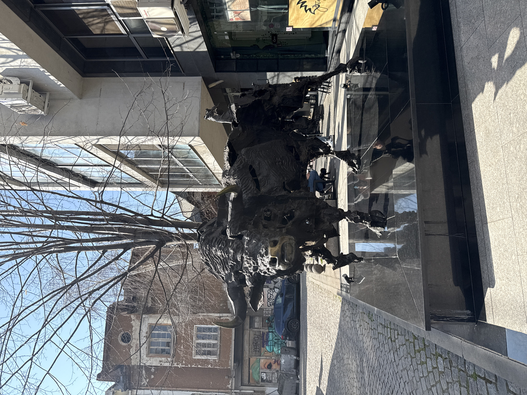The image displays "The Bull" sculpture by Todor Kozhuharov, located in front of the Bulgarian Stock Exchange (BSE) building at Tsar Kaloyan Street 1, Sofia, Bulgaria. The central subject is a large, dark, fragmented bronze sculpture of a bull, depicted in motion, with a smaller, stylized figure (possibly a bear) mounted on its back. The sculpture rests on a raised, rectangular base of polished black marble. To the left, a cobblestone street runs alongside an older, dilapidated building with a weathered brown facade, multiple rectangular windows, and a circular attic window. Extensive graffiti covers the ground level of this building, including a stylized face. A dark blue SUV is parked on the cobblestone street, next to two grey refuse bins. To the right, the modern facade of the BSE building features large glass windows and a light-colored concrete structure. Multiple external air conditioning units, one branded "Toshiba," are affixed to its exterior. The ground floor incorporates a reflective glass storefront. Bare tree branches, devoid of leaves, are prominent against a clear blue sky, casting shadows across the scene. Bright, direct sunlight illuminates the area, creating distinct shadows on the ground and building surfaces. Reflections of indistinct human figures are visible on the polished base of the sculpture and in the glass windows of the modern building.