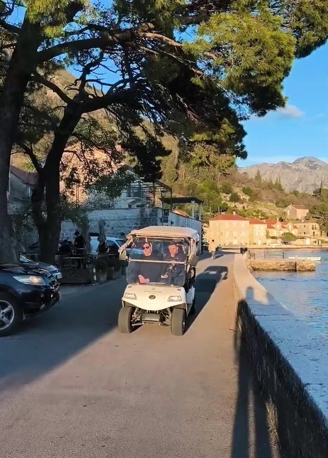 white golf cart with four occupants moving from right to left along a paved road next to a body of water on a sunny day. The road is bordered by a stone wall and a large tree. Buildings are visible in the background on both sides of the road. There is a car parked on the left side of the road next to some people seated at tables. Mountains are visible in the distance.