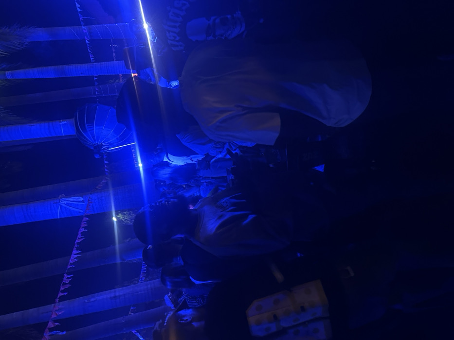 A crowd of people gathers under a structure adorned with hanging flags and a spherical lantern illuminated by vibrant blue lighting. The scene is dark, and the blue hue casts a strong, dominant color tone over the event. Silhouettes of individuals are visible, indicating a low-light environment and focusing attention on the illuminated elements.