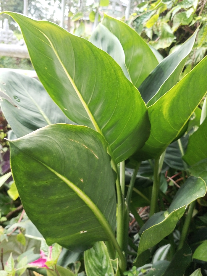 The image depicts a close-up view of dense, healthy plant foliage, located in the city of Mindat, Myanmar. The foreground is dominated by several large, ovate to lanceolate leaves, primarily a vibrant green. Each prominent leaf features a distinct, lighter green or yellowish central midrib. Subtle venation is visible on the leaf surfaces, which appear smooth and slightly glossy. Minor surface imperfections, including faint yellowing or small, indistinct marks, are present on some leaves. The plants display robust growth. The background is blurred, showing additional green foliage and, in the upper left quadrant, a partial view of a light-colored, possibly metallic, fence or structural element. The scene is illuminated by natural light. No human figures or discernible actions are present. The environment is an outdoor, vegetated area.