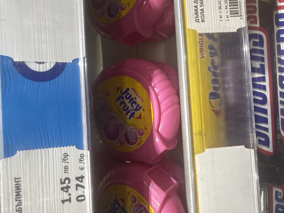 The image depicts a close-up view of a retail display shelf inside a store located in Nesebar, Bulgaria. The upper portion of the frame shows a white price tag with blue accents, displaying "АБЪЛМИНТ" (Apple Mint) and prices of 1.45 Bulgarian Leva (лв) and 0.74 Euros (€) per unit. Below this, the primary subject consists of several pink, circular plastic containers of Wrigley's Juicy Fruit chewing gum, arranged side-by-side on a white shelf. Each container features a prominent yellow label with "WRIGLEY'S Juicy Fruit" text in blue, and a smaller pink label indicating "Fancy Fruit." The containers exhibit a ribbed texture on their sides. Below this shelf, a yellow horizontal strip, partially visible, carries the text "WRIGLE" (Wrigley's). Beneath the yellow strip, a lower shelf displays various packaged items, including identifiable Snickers chocolate bars with their distinctive purple and blue packaging. No individuals are present in the scene; all objects are static and arranged for retail sale under standard store lighting conditions.