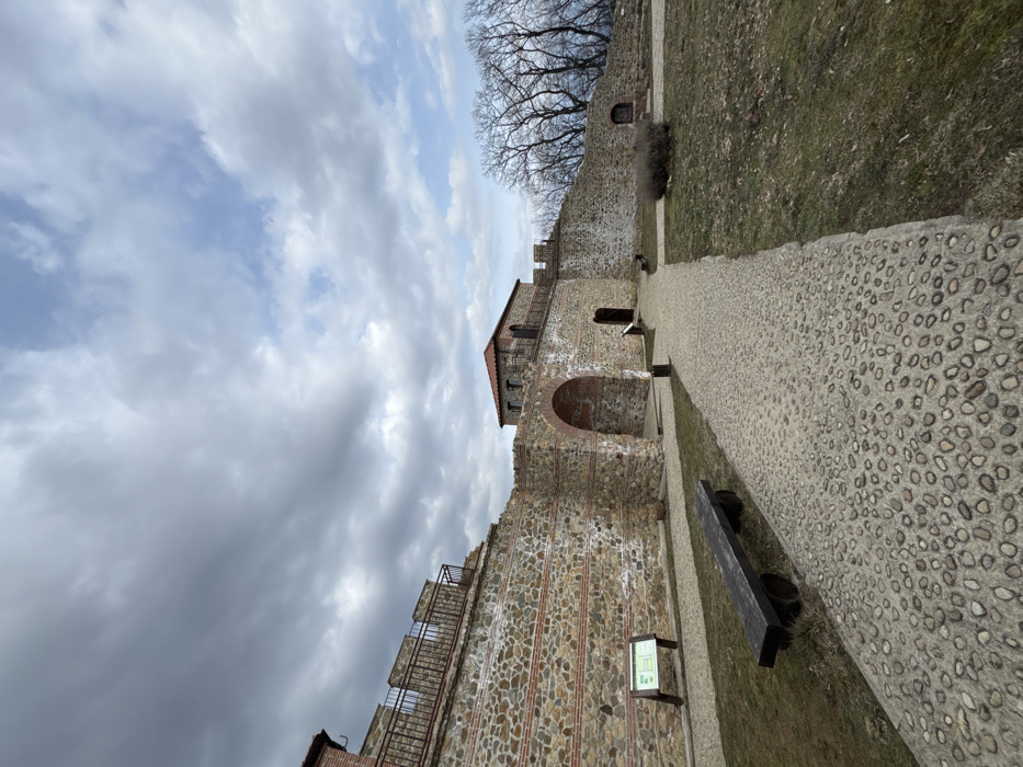 The scene depicts an exterior view of the Tsari Mali Grad Fortress in Belchin, Bulgaria, under a partially cloudy sky. A wide, pebble-stone pathway extends from the foreground, leading directly towards a prominent red-brick arched gateway integrated into a robust stone fortification wall. The fortification wall, constructed from irregular brown and grey stones interspersed with horizontal bands of red brickwork, dominates the left and central portions of the image. The upper section of the wall on the left features a battlement design with merlons and crenels, topped by a dark metal railing. Above this wall section, a red-tiled roof of an unseen structure is partially visible. To the right of the main archway, the wall continues, leading to another, smaller building with a red-tiled roof and an additional smaller arched opening or window on its right side. A smaller, darker wooden door is visible within the main archway's shadow. On the left side of the pebble pathway, a dark wooden bench with two circular wooden supports is positioned on sparse, yellowish-green grass. Further along the wall on the left, a green-framed information board with a diagram is visible. Another smaller, dark signpost stands on the right side of the path near the archway entrance. The ground surrounding the pathway consists of patchy, dry grass and bare earth. On the far right, a cluster of leafless deciduous trees with dark branches stands against the horizon. The sky is largely overcast with varying shades of grey clouds, though patches of blue sky are visible, particularly in the upper right quadrant. No individuals are present within the scene.