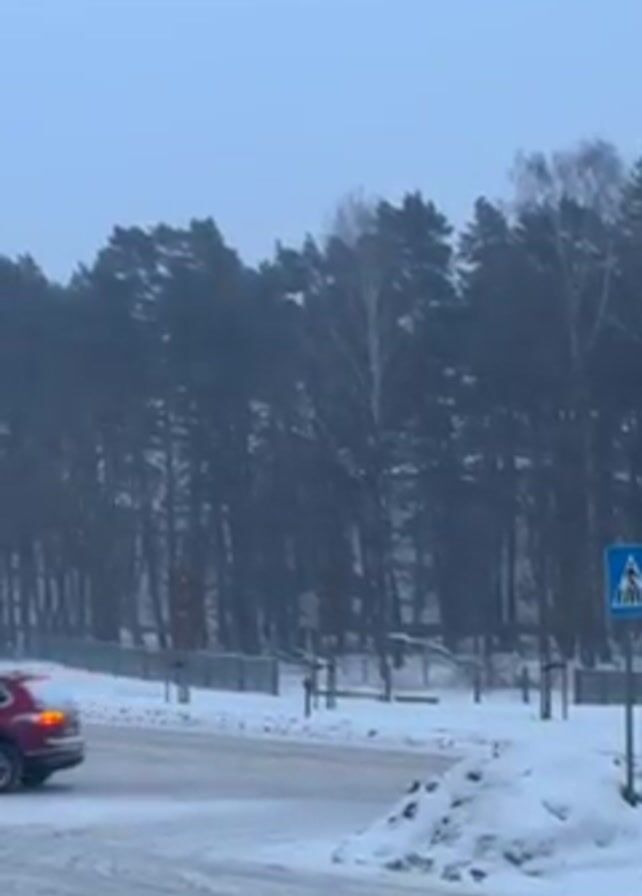 The scene is a wintery crossroads. The ground and sides of the road are covered in snow, with some areas appearing icy or slushy. In the background is a dense forest of pine trees, their dark silhouettes contrasting with the overcast, pale sky. Several cars are seen driving through the intersection. These include a red SUV, a dark grey sedan, and a blue sedan. A pedestrian crossing sign is visible near the crossroads, indicating a designated area for people to cross the street. The general atmosphere suggests a cold, overcast day in a location accustomed to snowy conditions.