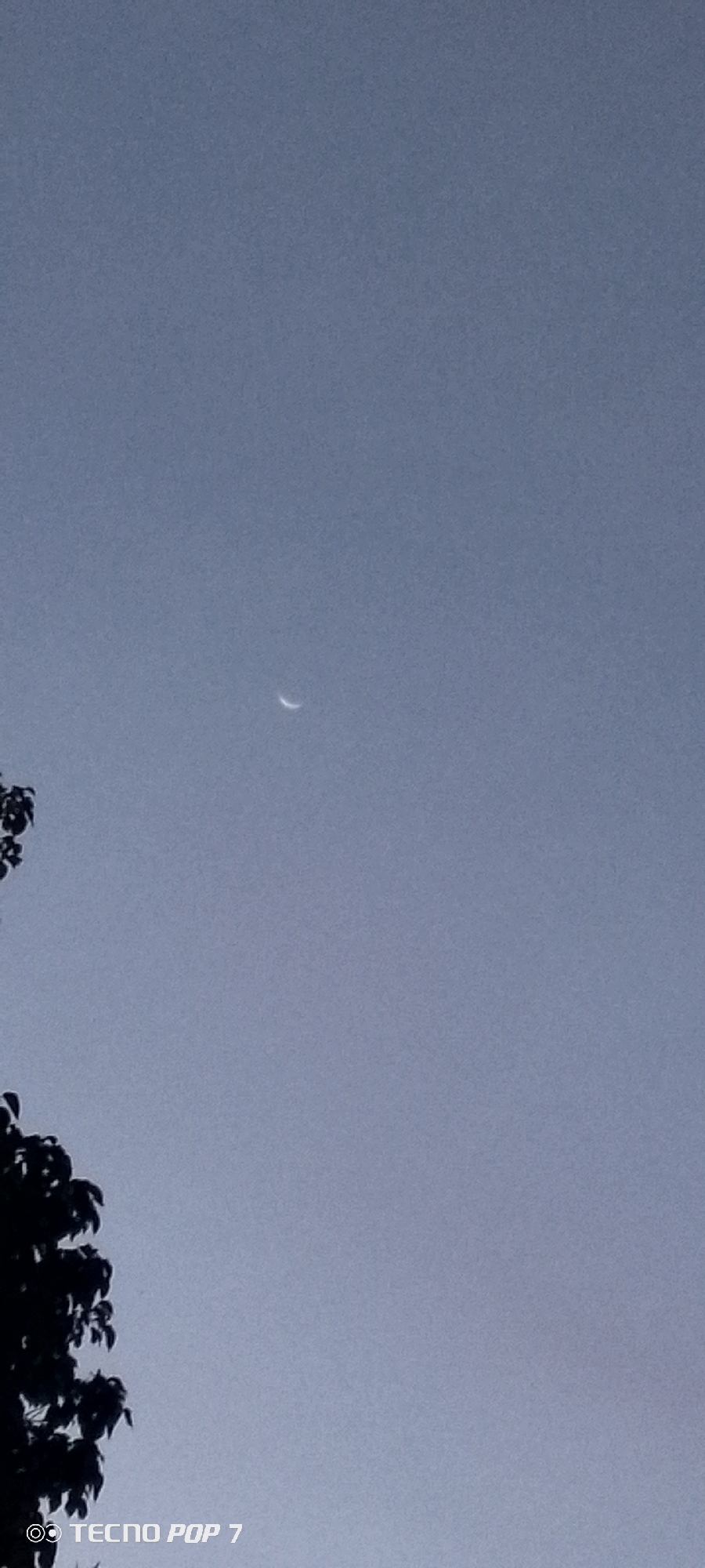 crescent moon in a blue-gray sky. A dark, silhouetted tree is visible in the lower left corner of the frame. The text "TECNO POP 7" is printed at the bottom left corner of the frame. There are no people in the image. There is no information regarding the location of the image to be in Altagracia, Venezuela.