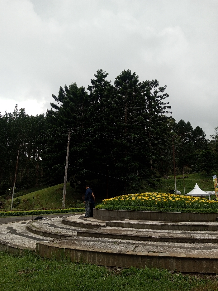 A man in a blue shirt and grey pants stands near a raised flower bed with yellow flowers. The flower bed is part of a circular, tiered structure with concrete steps. Behind him, tall evergreen trees fill the frame against a cloudy sky. Utility poles are visible among the trees. The scene includes a grassy area and a glimpse of a white tent-like structure. The overall impression is one of a public park or garden on a slightly overcast day.