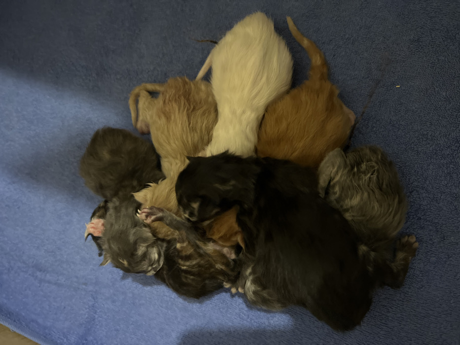 - "Approximately ten newborn kittens are observed tightly huddled together on a blue fabric surface, consistent with a blanket or towel" by FM-Ke9ym1, licensed under CC BY 4.0
