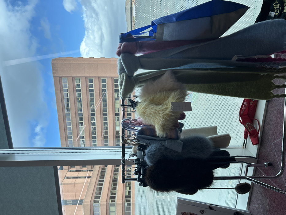 The image captures an indoor perspective looking out through a large window onto an urban setting in Garston, United Kingdom. In the immediate foreground, a chrome-plated mobile clothing rack is positioned, displaying a collection of winter accessories. These include several knitted hats, some featuring prominent fur pom-poms in dark brown and light grey, alongside other knitted items. Multiple long, knitted scarves hang from the rack, presenting in colors such as light green, light blue, and pink, with some exhibiting fringed edges. A fluffy yellow accessory, possibly a collar or scarf, is also visible, with a retail tag attached. To the far right, a blue and grey reusable shopping bag is suspended from the rack. On the white windowsill beneath the window, a red pouch or small bag, branded with "MOSCHINO," lies horizontally. The floor in the foreground is covered with a reddish-purple patterned carpet. Beyond the window, under a sky with patches of blue and white cumulus clouds, two large, multi-story urban buildings are visible. Both structures are constructed from a reddish-brown material, likely brick or concrete, and feature numerous rectangular windows arranged in consistent rows. One building stands prominently across the view, while a section of a similar building is visible to its left. A light grey roller blind is partially lowered at the top left of the window frame. No individuals are present in the scene.