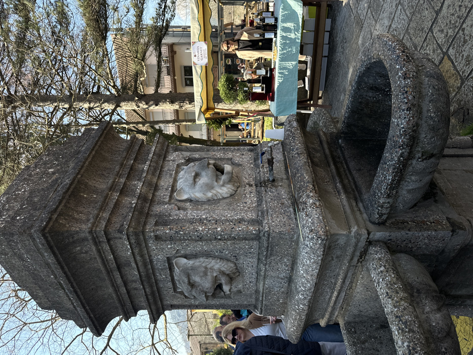 The scene depicts an outdoor public area in Orahovo, Montenegro, under clear daytime conditions. In the foreground and mid-ground, a multi-tiered stone fountain, constructed from dark grey aggregate, stands prominently. The fountain features at least two carved lion heads with open mouths on its central column, and two visible basin-like elements at its base. A modern blue spigot and a standard metal spigot are installed on the side of the fountain, above one basin, with a white plastic cup nearby. To the right of the fountain, a market stall with a light yellow awning and a light blue tablecloth is set up. A sign on the awning reads "VINARIJA GARNET MONTENEGRO." The stall displays multiple bottles, some in dark stands, alongside small plates of food items and a potted plant. A person with dark hair and sunglasses, wearing a light brown trench coat over a beige top, stands behind the stall. To the left of the fountain, a woman with blonde hair and sunglasses, wearing a light brown jacket over a white top, holds a stemmed glass. Part of another individual in a blue jacket is visible next to her. In the background, residential buildings with tiled roofs and balconies are visible among trees with bare branches and evergreens. Other indistinct figures and structures suggest further market activity in the distance. The ground surface appears paved with stone slabs.