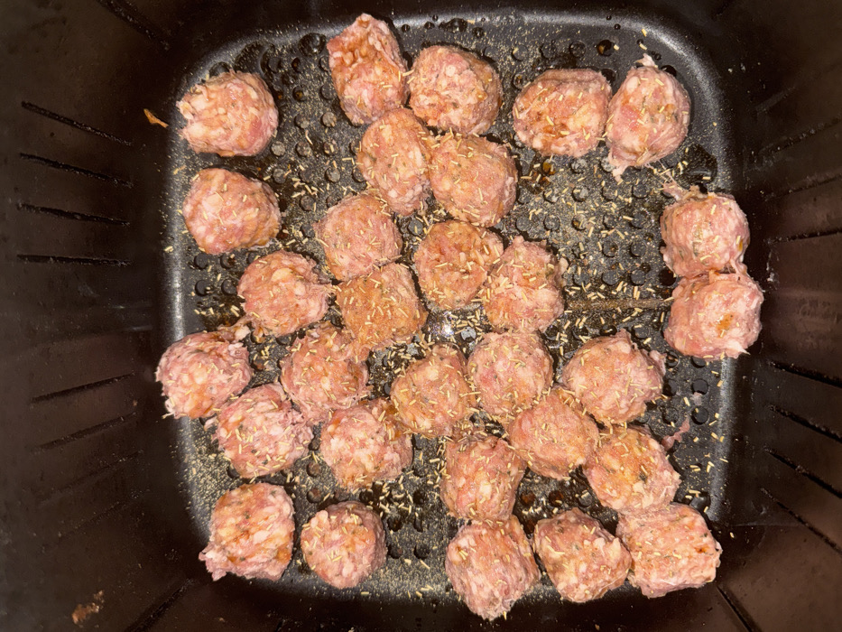 The image displays approximately 30-40 raw, seasoned meatballs resting within a black, perforated air fryer basket