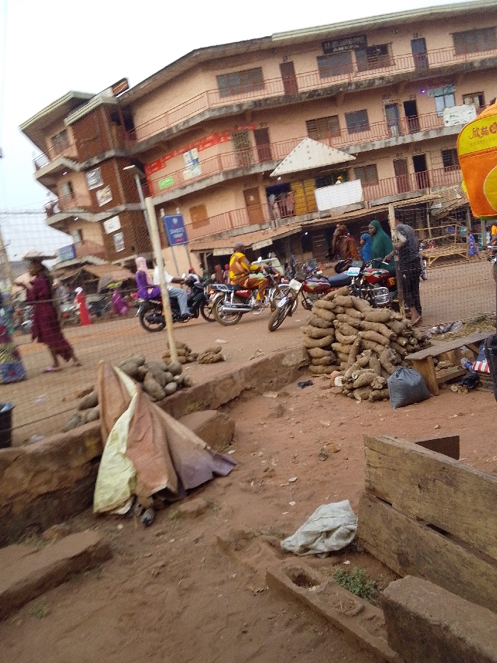 A bustling street scene unfolds with motorcyclists navigating through the crowd and merchandise. Piles of yams are stacked on the roadside. People are milling about, some wearing traditional garb. In the background, a multi-story building looms over the market, with signs visible on its facade. The ground is a reddish-brown dirt, with scattered trash and debris. A makeshift vendor stall is in the foreground.