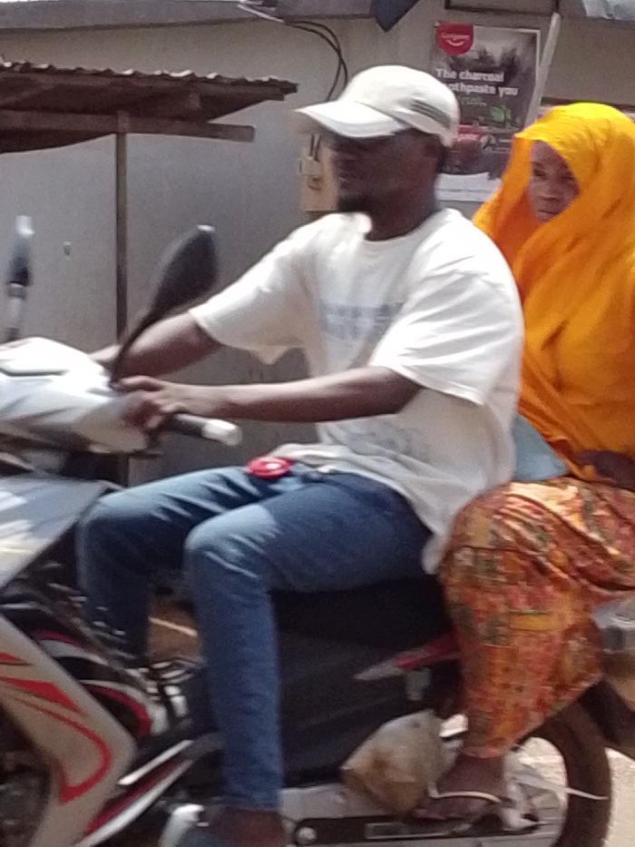 An adult male and an adult female are depicted on a light-colored motorcycle in Sabaa, Ghana