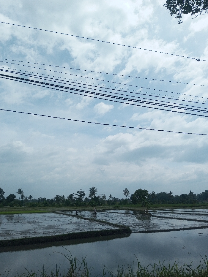 This image depicts an agricultural scene in Khajuripada, India, under a partly cloudy sky. The upper portion of the frame is dominated by a light blue sky with extensive white and grey cloud formations, traversed by approximately seven dark, horizontal utility wires. A dark, leafy tree branch partially intrudes from the upper right corner. The lower half of the image showcases flooded rice paddies, divided into rectangular plots by visible earth bunds. The water surface reflects the sky and surrounding foliage. Two individuals are present within the paddies; one figure, dressed in light-colored clothing, is positioned centrally, engaged in field work. A second figure, clad in darker attire, is further left and slightly behind the first, also working in the flooded field. The background features a dense line of diverse vegetation, including numerous palm trees and other broadleaf trees, forming a natural horizon. The immediate foreground displays sparse blades of green grass, partially obscuring the water's edge.