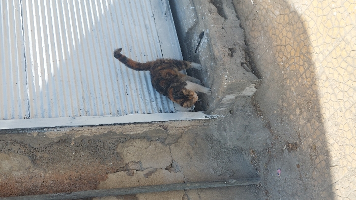 The scene depicts an outdoor urban setting in Al-Qaboun Municipality, Syria. A domestic calico cat, exhibiting a tortoiseshell fur pattern with distinct white markings on its face, chest, and front legs, is positioned on a raised, rough, grey concrete ledge. The cat's head is lowered and angled towards the ledge, suggesting an action of sniffing or close examination. Its tail is held erect and curved upwards. To the immediate right of the cat on the concrete ledge, a dark, slender object resembling a spoon is present. The background features a prominent, light-colored, horizontally corrugated metal roll-down shutter, which appears to be closed. Adjacent to the left edge of the shutter, a weathered concrete wall with visible aggregate and a vertical dark pipe or conduit runs upwards. The ground level below the concrete ledge transitions from a patch of dirt and debris directly beneath the wall to a paved area with light-colored, irregularly cracked polygonal tiles. The entire area is illuminated by strong direct sunlight, casting shadows. No human subjects are visible.