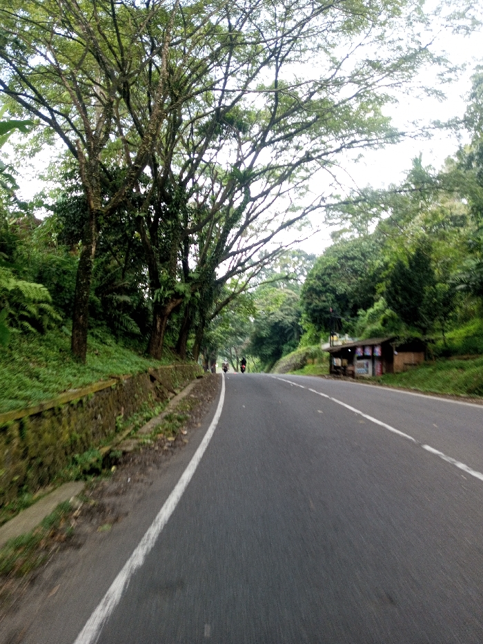 The image depicts a two-lane asphalt road traversing a densely vegetated area in Khajuripada, India. The perspective is from a low angle, looking forward along the road, which appears to gently curve and ascend. On the left side, a moss-covered stone retaining wall borders the road, behind which a steep embankment rises, covered in lush green foliage, including numerous ferns and dense undergrowth. A line of tall trees with widespread, leafy canopies, some draped with vines or epiphytes, extends along this side, partially obscuring the sky. On the right side of the road, further down, a small, rustic wooden structure with a dark roof, possibly a roadside stall or shack, is situated on a grassy slope. Its front displays various signs or posters. Beyond this structure and further along the right side, the terrain is also heavily forested with green trees and undergrowth. Two individuals on motorcycles are visible in the distance, traveling away from the camera on the road. The lead motorcycle is dark in color. The sky overhead is overcast and largely obscured by the tree canopy. The road features a solid white line marking the left shoulder and a dashed white line indicating a lane separator further down.