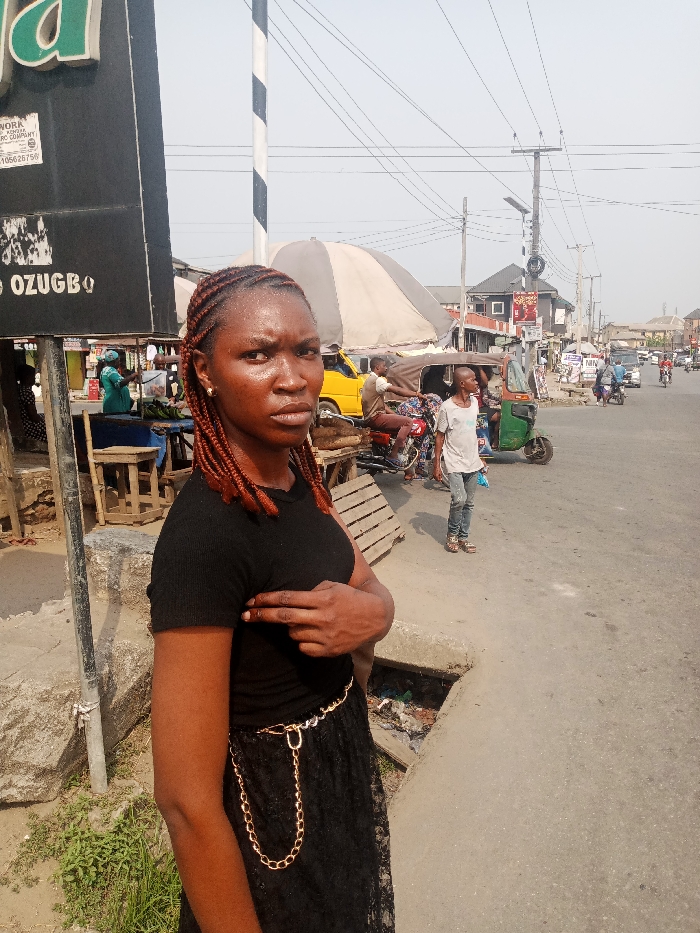 The image displays an outdoor street scene in Umuode, Nigeria, under a bright, hazy sky. In the immediate foreground, a female individual with brown skin and reddish-brown braided hair stands, gazing directly forward with a serious, focused expression. She wears a black short-sleeved top, a black lace skirt, and a gold chain belt. Her right index finger points towards her left chest. To her left, a tall black sign with green and white lettering (including "ORA", "WORK", "OZUGBO", and numerical sequences like "105626756") is affixed to a pole. Below this sign, a market stall with wooden tables and stools is visible, behind which a person in a teal outfit is seated. A black and white striped pole stands directly behind the main subject. At ground level, a concrete curb separates the foreground from the asphalt road, revealing an open drain containing debris. Sparse green vegetation grows near the curb. The midground features a bustling street. An off-white canopy shades a market stall. A yellow vehicle, multiple motorcycles (some with riders), and a green auto-rickshaw (keke napep) are present on the road. Another male individual in a light-colored t-shirt and jeans stands on the roadside, oriented to his right. In the background, the street extends, lined by various multi-story buildings and numerous utility poles with crisscrossing power lines. One utility pole features a visible solar panel. Additional vehicles and pedestrians are discernible further down the road, indicating active commercial and transport activity.