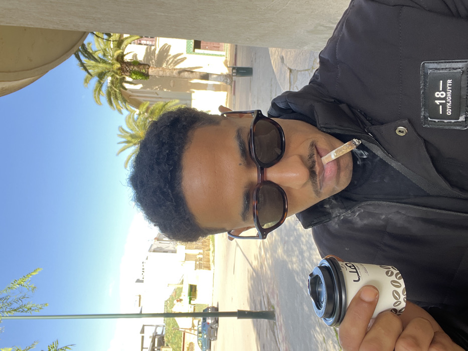 A male individual is depicted in a close-up outdoor selfie, situated in the city of Meknes, Morocco, on a sunny day with a clear blue sky