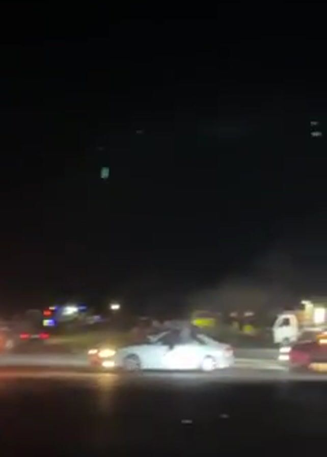 At night, two cars drift in a parking lot. Other parked cars and spectators stand in the background. A pickup truck with flashing lights is parked behind the drifters. A motorcycle passes in front of the camera as the drifting stops. Streetlights shine in the background.