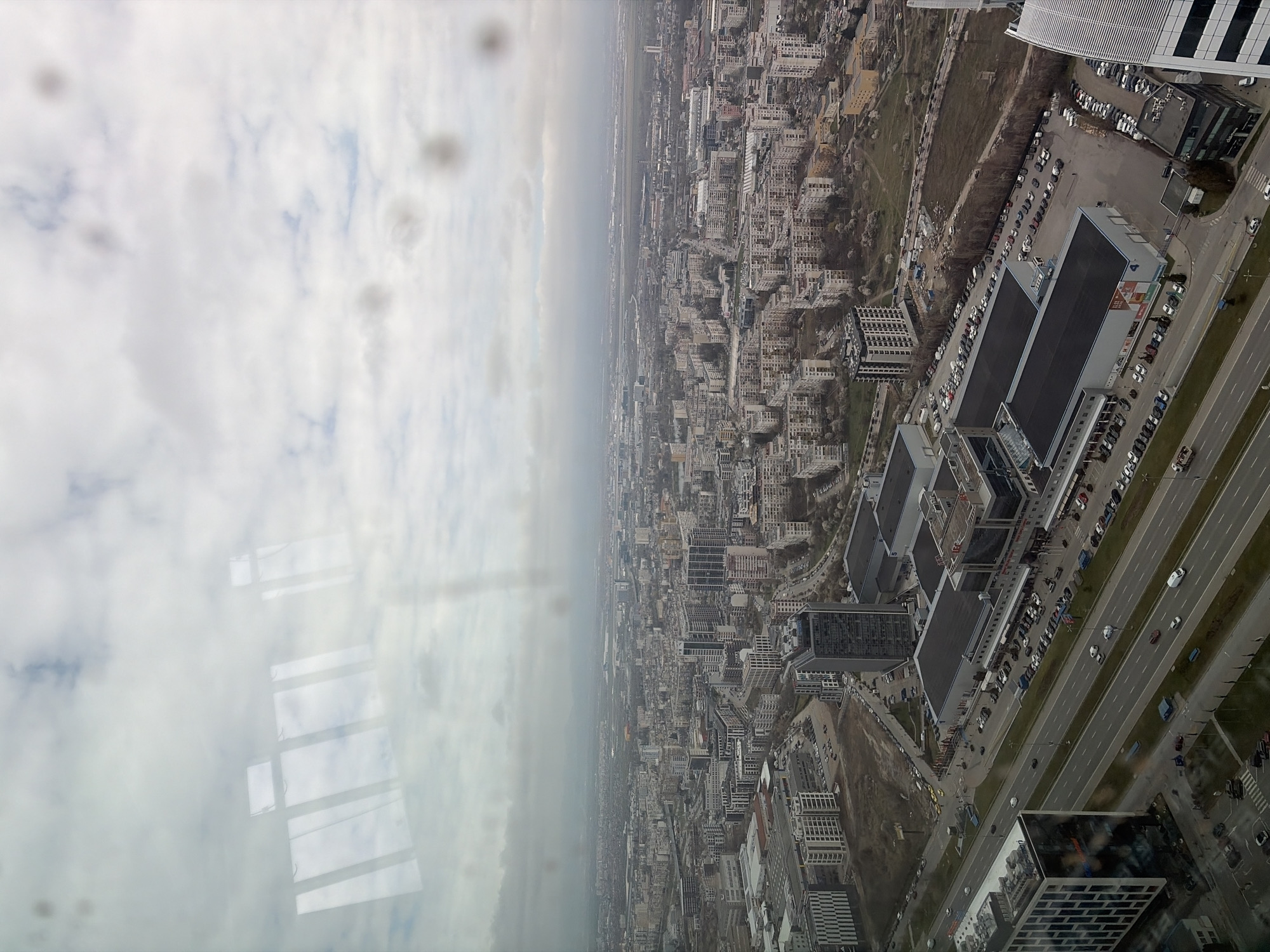 The image captures an aerial view of Sofia, Bulgaria, specifically focusing on the area around the Sofia Airport. The perspective is from a high vantage point, likely a tall building or airplane, looking down upon the city. On the right side of the image, large commercial buildings with extensive parking lots are visible. Cars are parked and driving along the roads. The urban sprawl of Sofia extends into the distance with a mix of residential and commercial buildings. The left side of the image shows the sky, heavily laden with clouds. The window through which the photo was taken is visible, with the reflections of window panes on the glass. Overall, the scene depicts a typical urban landscape with a mix of infrastructure, commercial development, and residential areas set against a backdrop of cloudy skies.