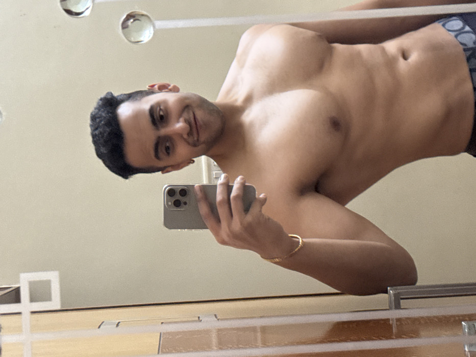 A shirtless man with dark hair takes a selfie in a mirror. He has a slight smile and looks directly at the camera. He is wearing a gold bracelet on his left wrist. The reflection in the mirror shows part of the bathroom, including the countertop and light fixtures above. He is wearing briefs. The image is rotated.