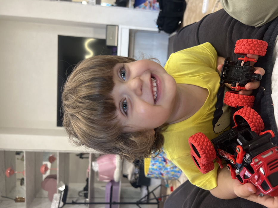 The scene is set indoors, likely in a residential living space in Khimki, Russia. A young child with brown hair and light-colored eyes is centrally featured, looking slightly to the viewer's right and smiling broadly, displaying upper teeth. The child wears a yellow short-sleeved t-shirt, which has a dark, possibly shark-shaped, graphic on the front. In both hands, the child holds two toy monster trucks, each featuring a black chassis and prominent red, textured wheels. In the background to the left, a white shelving unit is visible, displaying several items including pink decorative mushroom-shaped lamps, a pink heart-shaped object, and a purple box. A metallic light stand with a reflective element is positioned to the left of this shelving unit. To the right of the child, a wall-mounted black flat-screen television displays a light-colored wavy pattern. Below the television, on a white console, a dark rectangular speaker is present. A colorful, patterned bin is visible on the floor in the mid-background, and a black bag is on the floor to the far right. The child is situated over dark fabric, consistent with being seated on a lap or dark furniture.