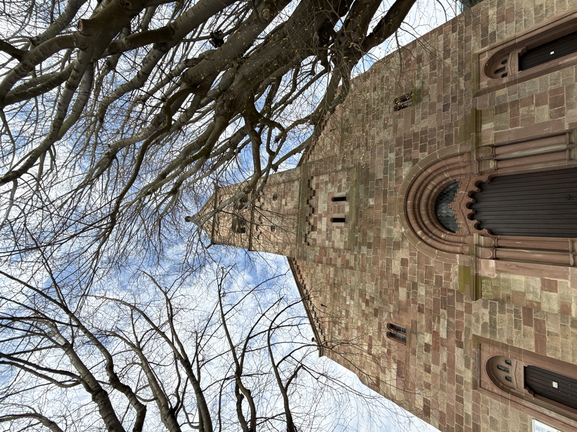 The image presents the Église Saint-Jean-Baptiste (Saint John the Baptist Church) in Lingolsheim, France, viewed from a low-angle perspective looking upwards towards its main facade and central tower. The structure is constructed from variegated reddish-brown and lighter-toned sandstone blocks laid in horizontal courses. A prominent central arched entrance features dark, vertically planked wooden double doors, topped by a partially visible semicircular stained-glass window. The arch itself is adorned with decorative molding and engaged columns. Two smaller, recessed arched doorways, also fitted with dark wooden doors, are positioned symmetrically on either side of the main entrance. Above these lower architectural elements, the facade contains multiple small, narrow, arched windows with stone frames. The central bell tower ascends directly from the main church structure, exhibiting additional arched openings and a distinctive stepped profile visible along its left edge. Patches of green moss or lichen growth are present on various stone surfaces and ledges, indicating natural weathering. The church building is significantly framed by the dense, intricate network of bare branches from several large deciduous trees, devoid of foliage, which extend across the foreground and into the upper and side portions of the scene. The sky overhead is partially cloudy, showing patches of clear blue amidst white cloud formations. No individuals or active subjects are visible within the frame.