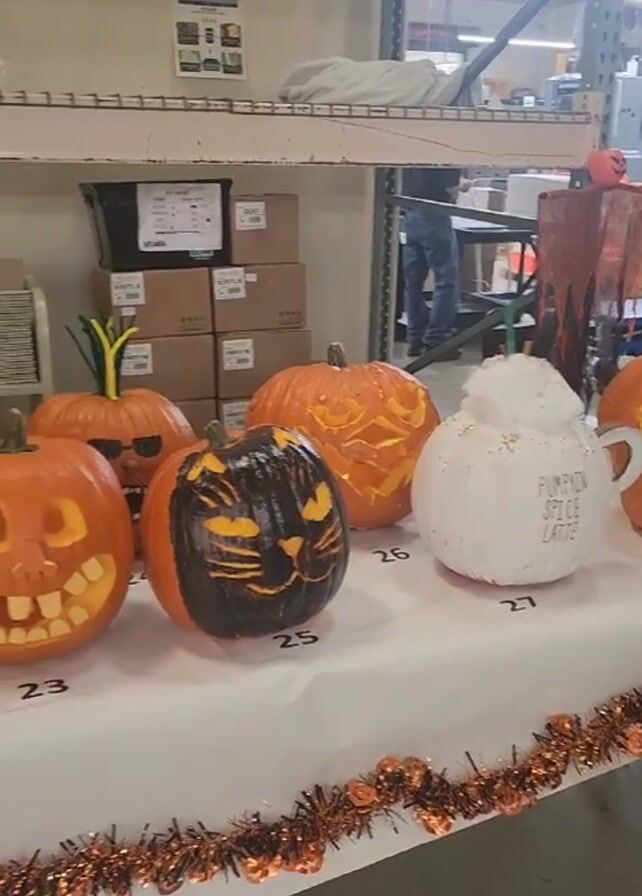 long white table filled with creatively decorated pumpkins, numbered for some kind of contest. The table is decorated with orange and black tinsel. The pumpkins include a black pumpkin with a cat face, a white pumpkin painted like a pumpkin spice latte, and a Frankenstein pumpkin painted green. Behind the table are shelves stacked with boxes and other items, suggesting this takes place in a storage area or warehouse. A few people are visible in the background.