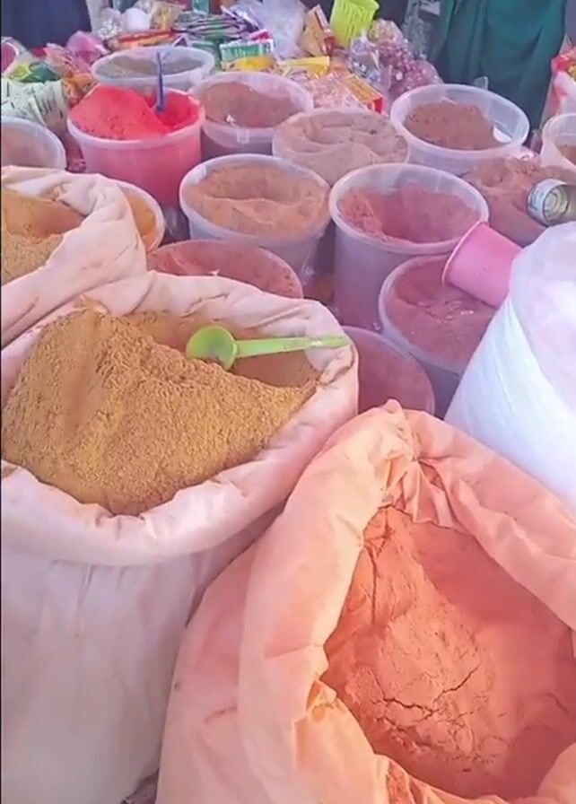 A high-angle shot depicts a market stall showcasing a wide array of spices and goods in bags and containers. The forefront features large sacks filled with different colored powders, one yellow and the other orange. The yellow bag has a green scoop resting in it. Behind these are multiple clear plastic containers of various spices, including red, brown, and off-white hues. To the right is a large white bag, possibly containing salt or sugar, with a green measuring cup and a metallic scoop resting on top. Several individuals are standing around the stall, their hands visible as they browse through the merchandise. The background is blurred, suggesting a bustling market environment. The scene is well-lit, and the colors of the spices are vibrant and distinct.