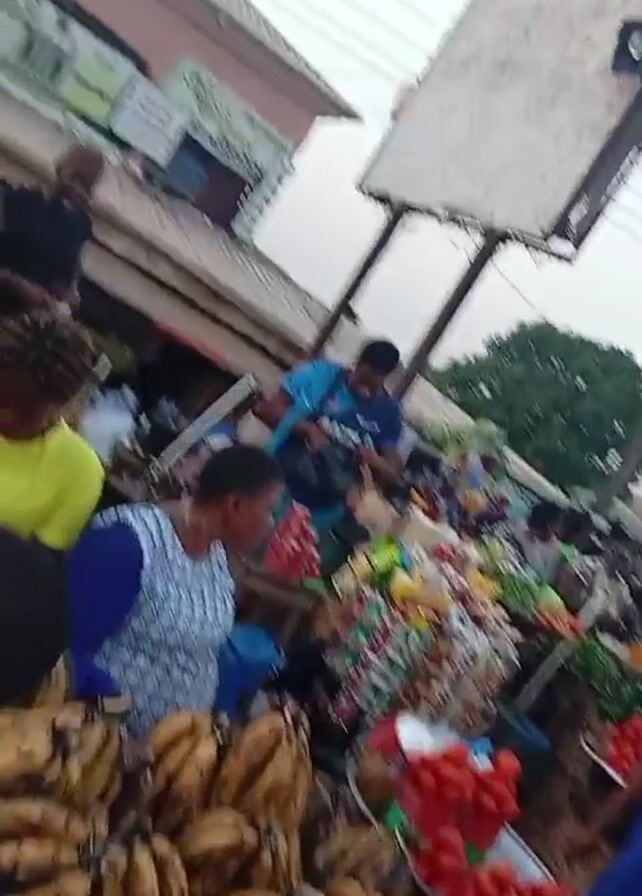 The video depicts a bustling outdoor market scene. Various vendors are seen attending to their stalls filled with produce. Bananas, tomatoes, and other fruits and vegetables are visible on display. People are milling around, presumably customers, interacting with the vendors. The camera moves slightly, capturing different perspectives of the market activity. Buildings and power lines are visible in the background, suggesting an urban or semi-urban setting. The overall atmosphere is one of a vibrant and active marketplace.